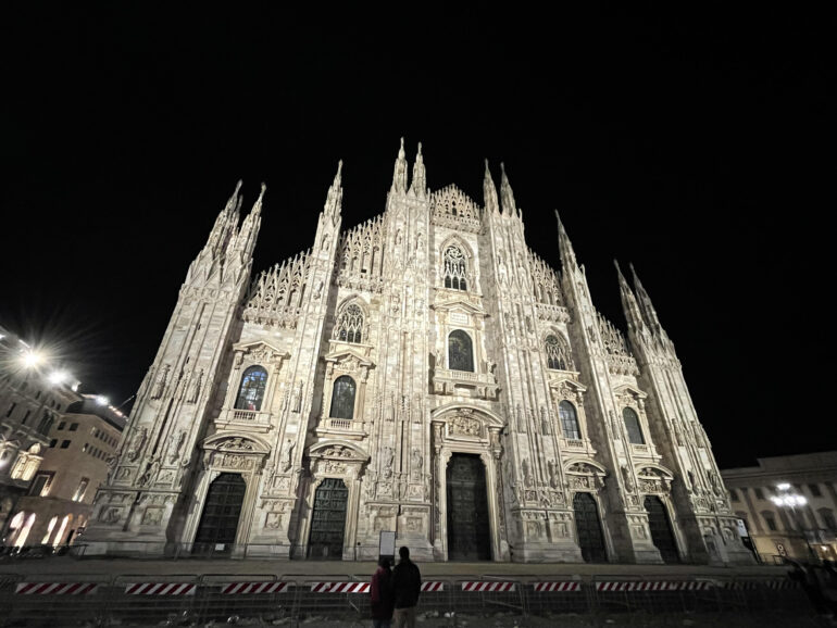 The historic Duomo of Milan takes the spotlight, the beautiful and detailed facade of the church looks even more dramatic at night.