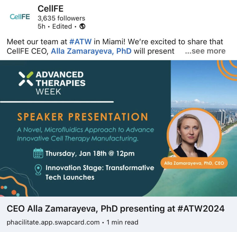 We’re excited to catch up with clients at Advanced Therapies Week in Miami. Speaking of clients, come see Alla Zamarayeva, PhD, CEO at CellFE, present her company’s transformative microfluidic platform on the Innovation Stage at the Miami Beach Convention Center.