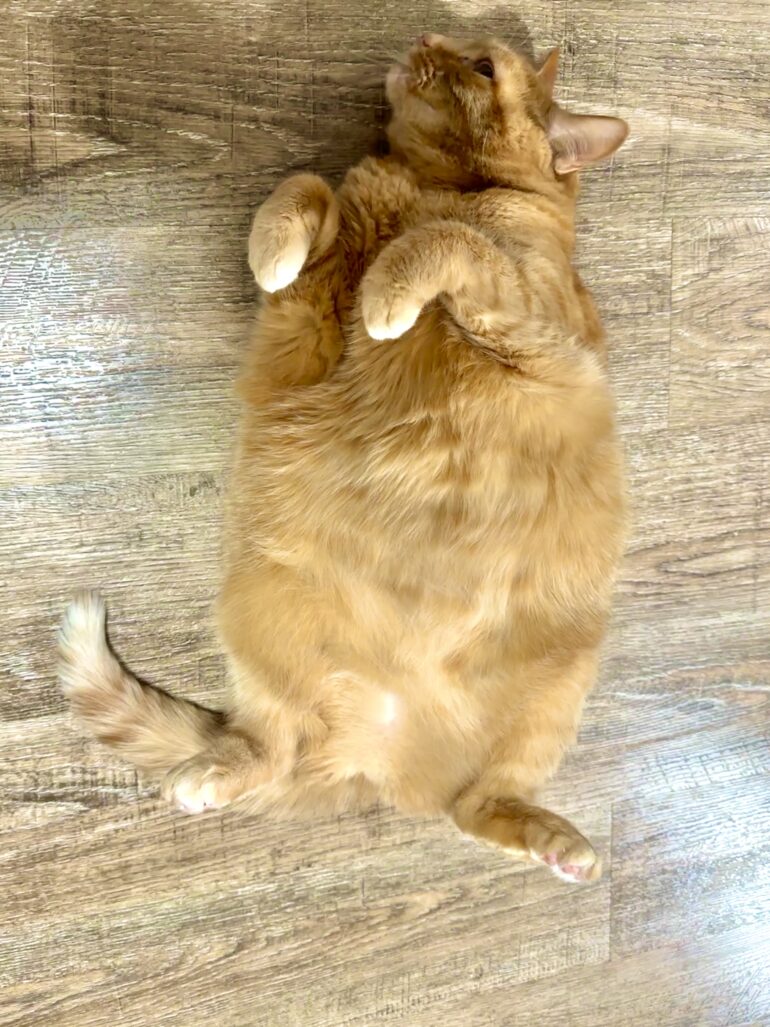 Guilty Sarah caught red-pawed scratching up the furniture. Her defense? To roll over on her back and plead the fifth.