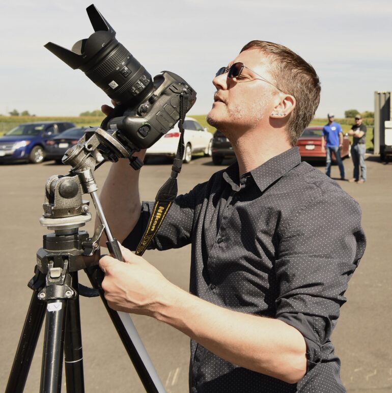Our videographer Lucas is rocking some really high-tech equipment. He can see people inside the camera! Hello people.