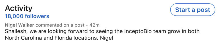 Nigel reaches 18,000 followers on LinkedIn and celebrates the growth of InceptorBio in both North Carolina and Florida locations.
