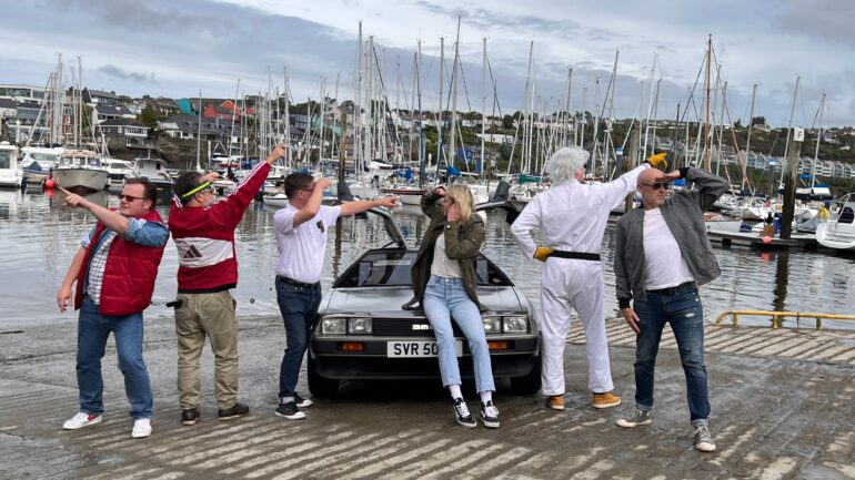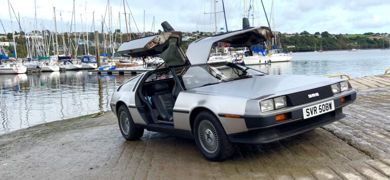 The DeLorean is looking like a fish out of water among the boats in the Kinsale harbor.