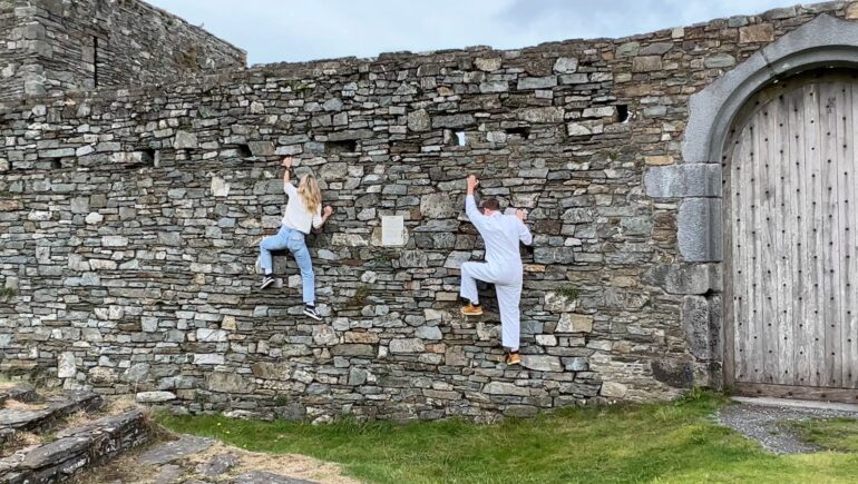 Emilee and George are racing to see who can storm the walls of James Fort first. Emilee, with her superior upper body strength, has taken an early lead.