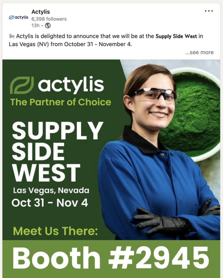 The newly rebranded Actylis serves a number of industries, including Life Sciences, AgriScience, and Specialty Chemicals, among others. Check out their booth at Supply Side West in Vegas to learn more.