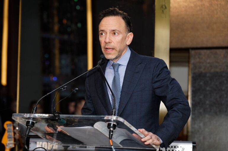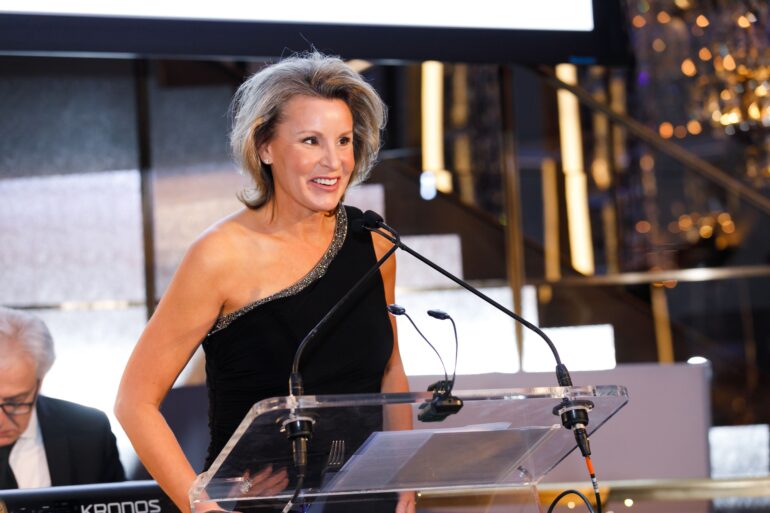 Michelle Calhoun, Interim Chief Commercial Officer at Scorpius, steps up to the Rainbow Room’s podium to kick off the evening’s events.