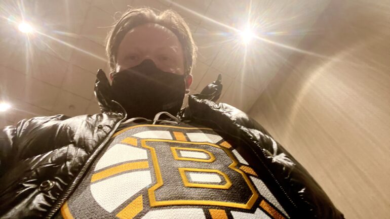 Nigel is suited up for his first NHL game at TD Garden — Boston Bruins vs. Florida Panthers.