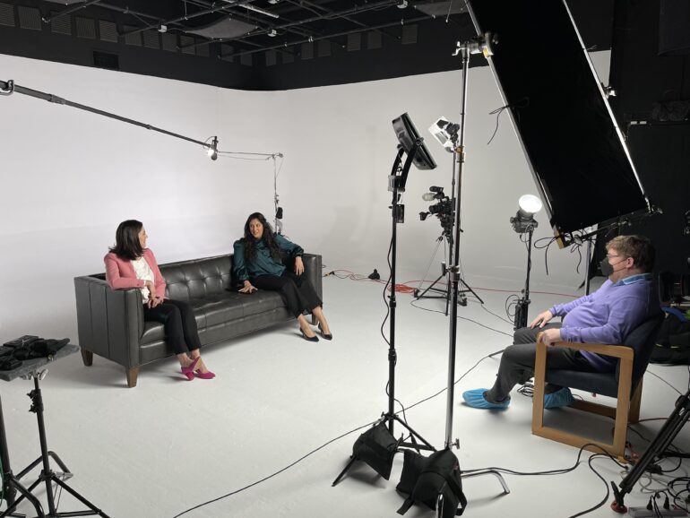 David and Lucas are getting everything set up for today’s video shoot with PPD. David models for Lucas, making sure all the angles are correct.
